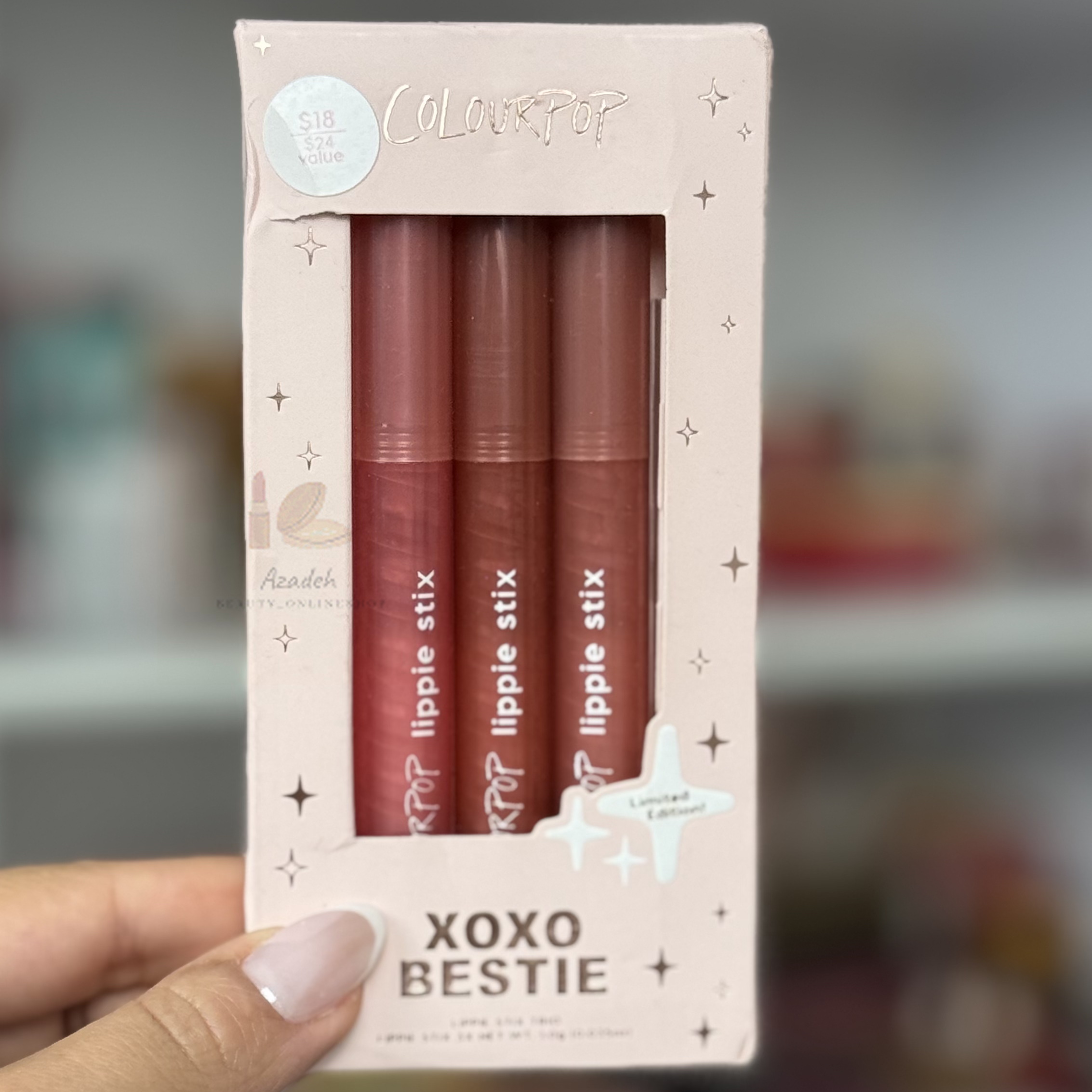 رژلب ColourPop XOXO Bestie Lippie Stix Trio یک پکیج محبوب از برند ColourPop است که شامل سه رنگ مات با فرمول نرم، پیگمنت بالا و ساختار لطیف میباشد:توضیحات: شامل سه رنگ پُرطرفدار و پرفروش با پوشش بارز در تنها یک بار کشیدن. فرمول آن محتوی ویتامین E، کره شی، روغن آووکادو و منگو است تا رطوبترسان و راحت روی لب استفاده شود.